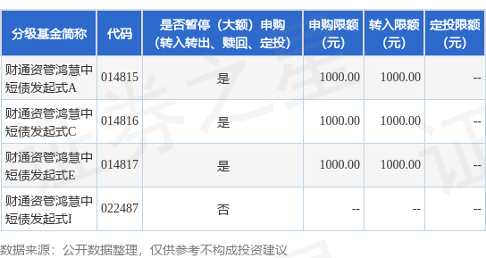 注:(1)根据法律法规和基金合同的相关规定,自2025年04月29日起,财通证券资产管理有限公司(以下简称“本公司”)将调整财通资管鸿慧中短债债券型发起式证券投资基金(以下简称“本基金”)A类、C类、E类份额在除本公司“直销渠道”、“国金证券股份有限公司”、“北京汇成基金销售有限公司”、“上海基煜基金销售有限公司”以外的其他渠道的大额申购(含转换转入、定期定额投资)业务。届时起,若单日单个基金账户单个渠道的单笔申购(含转换转入、定期定额投资)金额超过人民币1000元(不含)的,本公司将有权对超过1000元的部分予以拒绝。若单日单个基金账户单个渠道多笔累计申购(含转换转入、定期定额投资)金额超过人民币1000元的,则对申请按照申请金额从大到小排序,逐笔累加至不超过人民币1000元(含)限额的申请确认成功,对超过1000元的部分及其余笔数本公司有权予以拒绝。本基金A类、C类、E类份额分别单独判断。