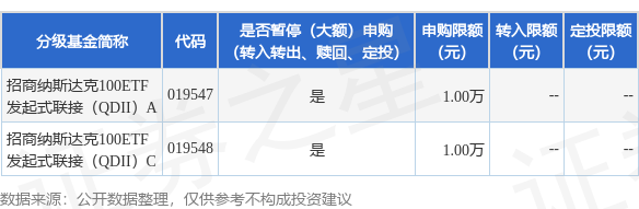 证券之星消息,5月8日招商基金管理有限公司发布《关于调整招商纳斯达克100交易型开放式指数证券投资基金发起式联接基金(QDII)大额申购(含定期定额投资)业务的公告》。公告中提示,为满足投资者需求,自2025年5月8日起调整招商纳斯达克100交易型开放式指数证券投资基金发起式联接基金(QDII)大额申购(含定期定额投资)业务,申购上限金额为1.0万元,下属分级基金调整明细如下:
