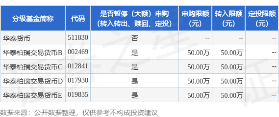 证券之星消息,6月5日华泰柏瑞基金管理有限公司发布《华泰柏瑞交易型货币市场基金B类基金份额、C类基金份额、D类基金份额和E类基金份额调整机构投资者大额申购及大额转换转入业务金额限制的公告》。公告中提示,为保证基金的平稳运作,维护基金持有人利益,自2025年6月5日起华泰柏瑞交易型货币市场基金B类基金份额、C类基金份额、D类基金份额和E类基金份额调整机构投资者大额申购及大额转换转入业务金额限制,申购、转换转入上限金额为50.0万元,下属分级基金调整明细如下: