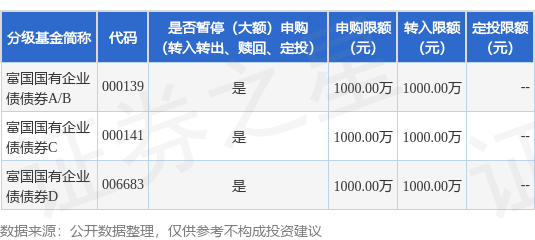 证券之星消息,6月7日富国基金管理有限公司发布《关于富国国有企业债债券型证券投资基金暂停大额申购、转换转入及定期定额投资业务的公告》。公告中提示,为了保证基金的平稳运作,保护基金持有人的利益,自2025年6月7日起富国国有企业债债券型证券投资基金暂停大额申购、转换转入及定期定额投资业务,下属分级基金调整明细如下: