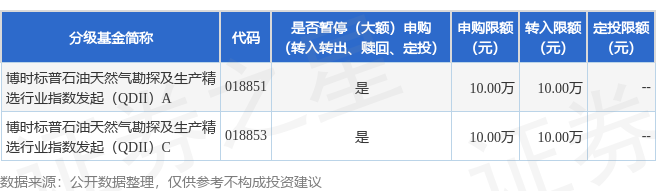 证券之星消息,6月28日博时基金管理有限公司发布《博时标普石油天然气勘探及生产精选行业指数型发起式证券投资基金(QDII)调整大额申购、转换转入、定期定额投资业务的公告》。公告中提示,为保护基金份额持有人利益,自2025年6月30日起博时标普石油天然气勘探及生产精选行业指数型发起式证券投资基金(QDII)调整大额申购、转换转入、定期定额投资业务,下属分级基金调整明细如下: