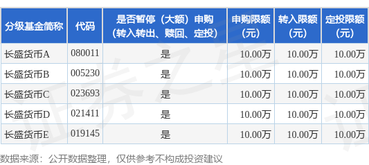 证券之星消息,7月9日长盛基金管理有限公司发布《长盛货币市场基金部分销售机构调整大额申购、转换转入、定期定额投资业务限额的公告》。公告中提示,为保护长盛货币市场基金份额持有人的利益,保障基金平稳运作,自2025年7月10日起长盛货币市场基金部分销售机构调整大额申购、转换转入、定期定额投资业务限额,申购、转换转入上限金额为10.0万元,下属分级基金调整明细如下: