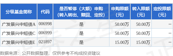 证券之星消息,7月11日广发基金管理有限公司发布《关于广发景兴中短债债券型证券投资基金调整机构投资者大额申购(含转换转入、定期定额和不定额投资)业务限额的公告》。公告中提示,为满足投资者的投资需求,自2025年7月14日起广发景兴中短债债券型证券投资基金调整机构投资者大额申购(含转换转入、定期定额和不定额投资)业务限额,下属分级基金调整明细如下: