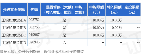 证券之星消息,7月16日工银瑞信基金管理有限公司发布《关于调整工银瑞信如意货币市场基金A类、B类、C类份额机构投资者大额申购、转换转入投资业务限制金额的公告》。公告中提示,为保护基金持有人利益,自2025年7月17日起调整工银瑞信如意货币市场基金A类、B类、C类份额机构投资者大额申购、转换转入投资业务限制金额,申购、转换转入上限金额为10.0万元,下属分级基金调整明细如下: