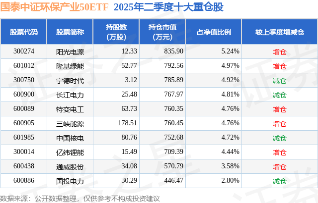 从基金规模来看,国泰中证环保产业50ETF基金2025年二季度公布的基金规模为1.6亿元,较上一期规模1.63亿元变化了-369.78万元,环比变化了-2.26%。该基金最新一期资产配置为:股票占净值比98.82%,无债券类资产,现金占净值比1.8%。从基金持仓来看,该基金当季前十大股票仓位达45.0%,第一大重仓股为阳光电源(300274),持仓占比为5.24%。