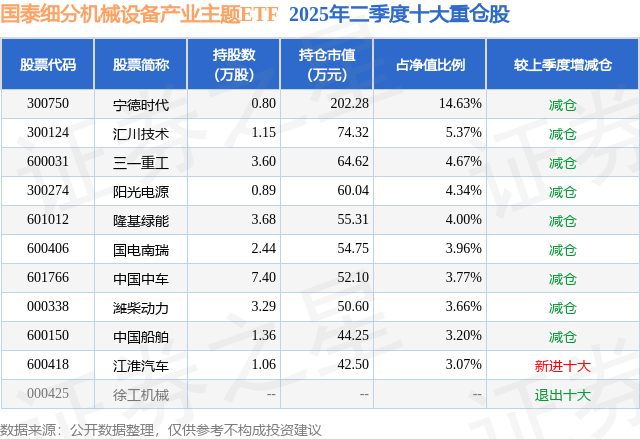 从基金规模来看,国泰细分机械设备产业主题ETF基金2025年二季度公布的基金规模为0.14亿元,较上一期规模1933.49万元变化了-550.7万元,环比变化了-28.48%。该基金最新一期资产配置为:股票占净值比96.95%,无债券类资产,现金占净值比3.03%。从基金持仓来看,该基金当季前十大股票仓位达50.67%,第一大重仓股为宁德时代(300750),持仓占比为14.63%。