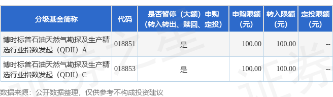 证券之星消息,7月30日博时基金管理有限公司发布《博时标普石油天然气勘探及生产精选行业指数型发起式证券投资基金(QDII)调整大额申购、转换转入、定期定额投资业务的公告》。公告中提示,为保护基金份额持有人利益,自2025年7月31日起博时标普石油天然气勘探及生产精选行业指数型发起式证券投资基金(QDII)调整大额申购、转换转入、定期定额投资业务,下属分级基金调整明细如下: