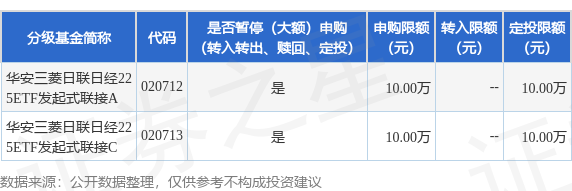 证券之星消息,7月30日华安基金管理有限公司发布《关于华安三菱日联日经225交易型开放式指数证券投资基金发起式联接基金(QDII)暂停大额申购及大额定期定额投资的公告》。公告中提示,为了保证基金的平稳运作,保护基金持有人利益,本基金管理人决定自2025年7月30日起暂停本基金的大额申购及大额定期定额投资业务,自2025年7月30日起华安三菱日联日经225交易型开放式指数证券投资基金发起式联接基金(QDII)暂停大额申购及大额定期定额投资,申购上限金额为10.0万元,下属分级基金调整明细如下: