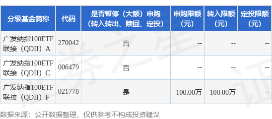 证券之星消息,7月30日广发基金管理有限公司发布《关于广发纳斯达克100交易型开放式指数证券投资基金联接基金(QDII)F类基金份额调整大额申购(含转换转入、定期定额和不定额投资)业务限额的公告》。公告中提示,为满足投资者的投资需求,自2025年7月31日起广发纳斯达克100交易型开放式指数证券投资基金联接基金(QDII)F类基金份额调整大额申购(含转换转入、定期定额和不定额投资)业务限额,下属分级基金调整明细如下: