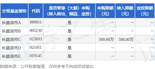 证券之星消息,8月8日长盛基金管理有限公司发布《长盛货币市场基金部分销售机构调整大额申购、转换转入、定期定额投资业务限额的公告》。公告中提示,为保护基金份额持有人的利益,保障基金平稳运作,自2025年8月8日起长盛货币市场基金部分销售机构调整大额申购、转换转入、定期定额投资业务限额,申购、转换转入上限金额为500.0万元,下属分级基金调整明细如下: