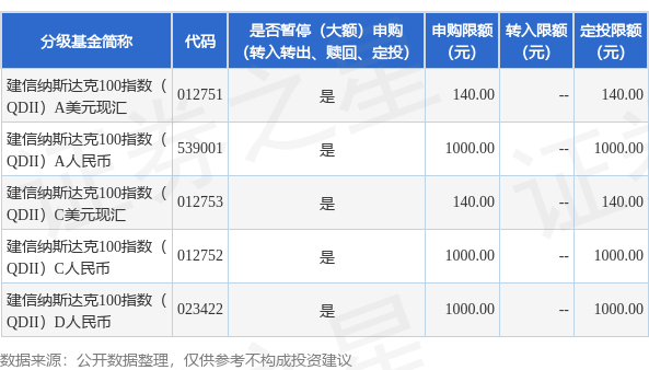 证券之星消息,9月1日建信基金管理有限责任公司发布《建信纳斯达克100指数型证券投资基金(QDII)基金暂停大额申购、定期定额投资公告》。公告中提示,为保护投资者利益,自2025年9月3日起建信纳斯达克100指数型证券投资基金(QDII)基金暂停大额申购、定期定额投资,下属分级基金调整明细如下: