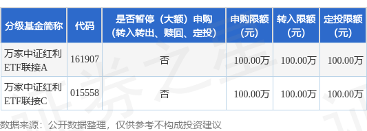 证券之星消息,9月2日万家基金管理有限公司发布《关于万家中证红利交易型开放式指数证券投资基金联接基金暂停大额申购(含转换转入、定期定额投资)的公告》。公告中提示,为了保证基金的平稳运作,保护基金份额持有人的利益,自2025年9月2日起万家中证红利交易型开放式指数证券投资基金联接基金暂停大额申购(含转换转入、定期定额投资),申购、转换转入上限金额为100.0万元,下属分级基金调整明细如下:
