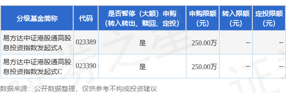 注:根据法律法规及基金法律文件的相关规定,易方达基金管理有限公司决定自2025年9月4日起暂停易方达中证港股通高股息投资指数发起式证券投资基金(以下简称“本基金”)机构客户在全部销售机构A类基金份额和C类基金份额的大额申购业务,单日单个基金账户在全部销售机构累计申购(含定期定额投资,下同)本基金A类基金份额或C类基金份额的金额不超过250万元(含)。如单日单个基金账户单笔申购本基金A类基金份额或C类基金份额的金额超过250万元(不含),则250万元确认申购成功,超过250万元(不含)金额的部分将确认失败;如单日单个基金账户多笔累计申购本基金A类基金份额的金额超过250万元(不含)或单日单个基金账户多笔累计申购本基金C类基金份额的金额超过250万元(不含),则对该类基金份额的申请按照申请金额从大到小排序,基金管理人将逐笔累加至该类基金份额不超过250万元(含)限额的申请确认成功,该类基金份额其余申请金额确认失败。