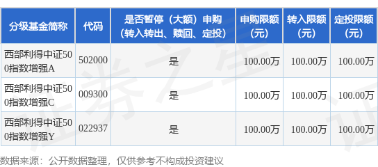 注:(1)为投资管理及保护基金份额持有人利益,自2025年9月17日起,西部利得中证500指数增强型证券投资基金(LOF)(以下简称“本基金”)在全部销售渠道暂停大额申购、大额转换转入、大额定期定额投资业务。