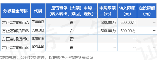 证券之星消息,9月18日方正富邦基金管理有限公司发布《方正富邦货币市场基金A类份额和B类份额调整代销渠道大额申购(转换转入、定期定额投资)业务的公告》。公告中提示,为了保证基金的平稳运作,保护基金份额持有人的利益,自2025年9月19日起,调整方正富邦货币市场基金A类份额和B类份额代销渠道大额申购(含转换转入、定期定额投资)业务的限额,自2025年9月19日起方正富邦货币市场基金A类份额和B类份额调整代销渠道大额申购(转换转入、定期定额投资)业务,申购、转换转入上限金额为500.0万元,下属分级基金调整明细如下:
