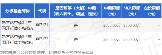 注:(1)根据法律法规和基金合同的相关规定,易方达基金管理有限公司决定自2025年9月30日起,易方达中债3-5年国开行债券指数证券投资基金(以下简称“本基金”)A类基金份额和C类基金份额在全部销售机构暂停机构客户的大额申购及大额转换转入业务,单日单个基金账户在全部销售机构累计申购(含定期定额投资及转换转入,下同)本基金A类基金份额或C类基金份额的金额不超过2500万元(含)。如单日单个基金账户单笔申购本基金A类基金份额或C类基金份额的金额超过2500万元(不含),则2500万元确认申购成功,超过2500万元(不含)金额的部分将确认失败;如单日单个基金账户多笔累计申购本基金A类基金份额的金额超过2500万元(不含)或单日单个基金账户多笔累计申购本基金C类基金份额的金额超过2500万元(不含),则对该类基金份额的申请按照申请金额从大到小排序,基金管理人将逐笔累加至该类基金份额不超过2500万元(含)限额的申请确认成功,该类基金份额其余申请金额确认失败。