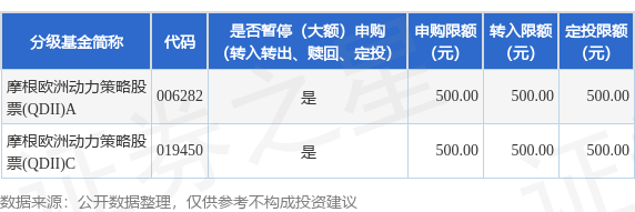 证券之星消息,9月25日摩根基金管理(中国)有限公司发布《摩根欧洲动力策略股票型证券投资基金(QDII)调整大额申购、定期定额投资及转换转入业务的公告》。公告中提示,为保证本基金的稳定运作,保护基金份额持有人利益,自2025年9月25日起摩根欧洲动力策略股票型证券投资基金(QDII)调整大额申购、定期定额投资及转换转入业务,下属分级基金调整明细如下: