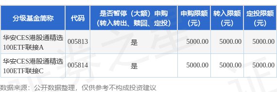 证券之星消息,9月26日华安基金管理有限公司发布《关于华安CES港股通精选100交易型开放式指数证券投资基金联接基金暂停大额申购、大额转换转入及大额定期定额投资的公告》。公告中提示,为了保证基金的平稳运作,保护基金持有人利益,本基金管理人决定自2025年9月30日起暂停本基金的大额申购、大额转换转入及大额定期定额投资业务,自2025年9月30日起华安CES港股通精选100交易型开放式指数证券投资基金联接基金暂停大额申购、大额转换转入及大额定期定额投资,申购、转换转入上限金额为0.5万元,下属分级基金调整明细如下: