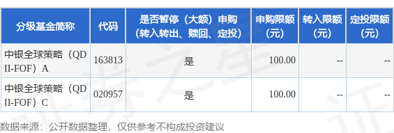证券之星消息,9月29日中银基金管理有限公司发布《关于中银全球策略证券投资基金(FOF)暂停大额申购及定期定额投资业务的公告》。公告中提示,为保护基金份额持有人利益,自2025年9月29日起中银全球策略证券投资基金(FOF)暂停大额申购及定期定额投资业务,下属分级基金调整明细如下: