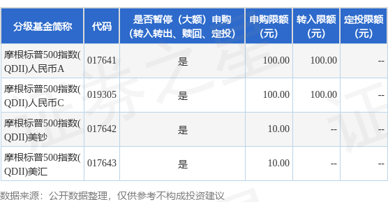 证券之星消息,9月30日摩根基金管理(中国)有限公司发布《摩根标普500指数型发起式证券投资基金(QDII)调整大额申购、定期定额投资及转换转入业务的公告》。公告中提示,为保证本基金的稳定运作,保护基金份额持有人利益,自2025年9月30日起摩根标普500指数型发起式证券投资基金(QDII)调整大额申购、定期定额投资及转换转入业务,下属分级基金调整明细如下: