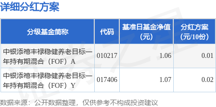 证券之星消息,10月22日发布《中银添禧丰禄稳健养老目标一年持有期混合型基金中基金(FOF)分红公告》。本次分红为2025年度的第1次分红。公告显示,本次分红的收益分配基准日为10月10日,详细分红方案如下: