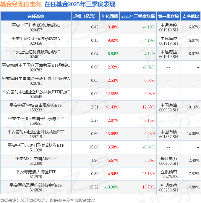 平安粤港澳大湾区ETF现任基金经理为白圭尧,近期离任的基金经理为刘洁倩。其中在任基金经理白圭尧已从业0年又123天,2025年6月25日正式接手管理平安粤港澳大湾区ETF,任职期间累计回报为25.64%。目前还管理着13只基金产品(包括A类和C类),其中本季度表现最佳的基金为平安粤港澳大湾区ETF(512970),季度净值涨幅为25.13%。