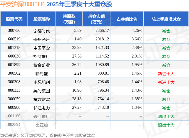 从基金规模来看,平安沪深300ETF基金2025年三季度公布的基金规模为5.55亿元,较上一期规模5.56亿元变化了-93.34万元,环比变化了-0.17%。该基金最新一期资产配置为:股票占净值比98.51%,无债券类资产,现金占净值比3.02%。从基金持仓来看,该基金当季前十大股票仓位达21.29%,第一大重仓股为宁德时代(300750),持仓占比为4.26%。