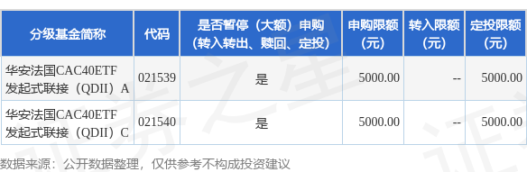 证券之星消息,10月27日华安基金管理有限公司发布《关于华安法国CAC40交易型开放式指数证券投资基金发起式联接基金(QDII)暂停大额申购及大额定期定额投资的公告》。公告中提示,为了保证基金的平稳运作,保护基金持有人利益,本基金管理人决定自2025年10月28日起暂停本基金的大额申购及大额定期定额投资业务,自2025年10月28日起华安法国CAC40交易型开放式指数证券投资基金发起式联接基金(QDII)暂停大额申购及大额定期定额投资,申购上限金额为0.5万元,下属分级基金调整明细如下: