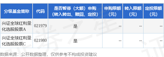 证券之星消息,10月27日兴证全球基金管理有限公司发布《兴证全球红利量化选股股票型证券投资基金暂停申购(含定投)、赎回、转换业务的公告》。公告中提示,为非港股通交易日,自2025年10月29日起兴证全球红利量化选股股票型证券投资基金暂停申购(含定投)、赎回、转换业务,下属分级基金调整明细如下: