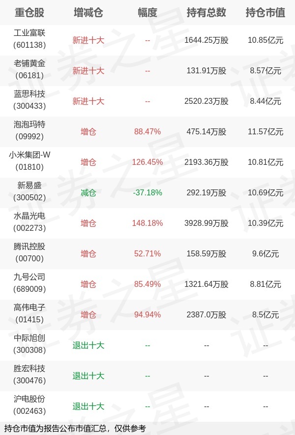 证券之星消息,10月28日景顺长城基金旗下农冰立管理的景顺长城品质长青混合型基金公布三季报,近1年净值增长率84.42%。与上一季度相比,该基金前十大重仓股新增工业富联,老铺黄金,蓝思科技;并对泡泡玛特增仓223.04万股,为该基金第一大重仓股;中际旭创,胜宏科技,沪电股份等退出前十大重仓股;详细数据如下:
