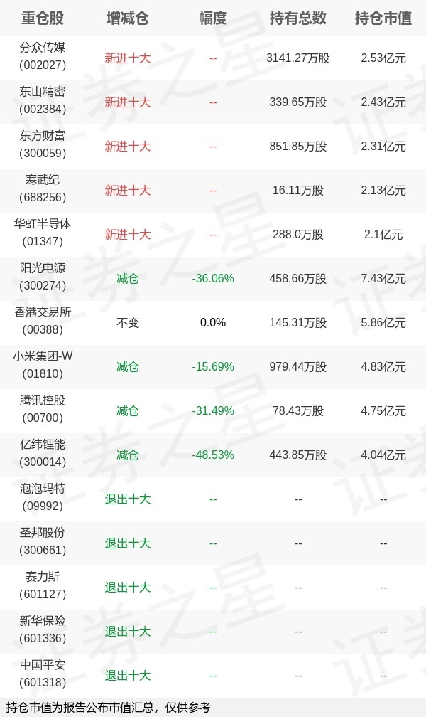 证券之星消息,10月28日广发基金旗下刘格菘 周智硕管理的广发行业严选三年持有期混合型基金公布三季报,近1年净值增长率8.92%。与上一季度相比,该基金前十大重仓股新增分众传媒,东山精密,东方财富,寒武纪,华虹半导体;其中阳光电源持仓占比11.09%,为该基金第一大重仓股;泡泡玛特,圣邦股份,赛力斯,新华保险,中国平安等退出前十大重仓股;详细数据如下: