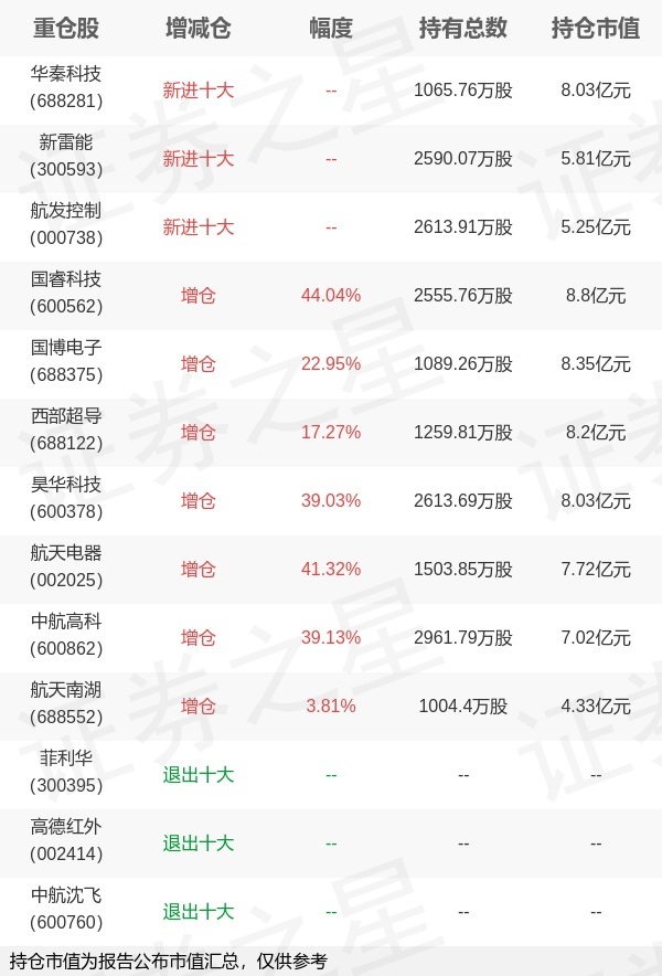 证券之星消息,10月28日华夏基金旗下万方方管理的华夏军工安全灵活配置混合型基金公布三季报,近1年净值增长率22.92%。与上一季度相比,该基金前十大重仓股新增华秦科技,新雷能,航发控制;并对国睿科技增仓781.4万股,为该基金第一大重仓股;菲利华,高德红外,中航沈飞等退出前十大重仓股;详细数据如下: