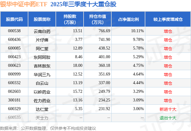 从基金规模来看,银华中证中药ETF基金2025年三季度公布的基金规模为0.76亿元,较上一期规模5141.06万元变化了2443.77万元,环比变化了47.53%。该基金最新一期资产配置为:股票占净值比98.42%,无债券类资产,现金占净值比2.16%。从基金持仓来看,该基金当季前十大股票仓位达54.23%,第一大重仓股为云南白药(000538),持仓占比为10.11%。