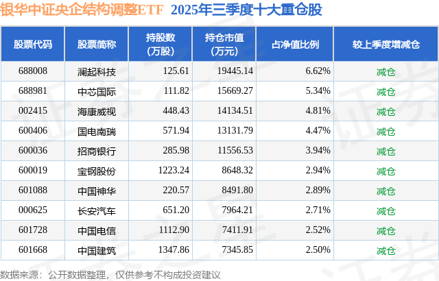 从基金规模来看,银华中证央企结构调整ETF基金2025年三季度公布的基金规模为29.37亿元,较上一期规模28.15亿元变化了1.22亿元,环比变化了4.32%。该基金最新一期资产配置为:股票占净值比97.07%,无债券类资产,现金占净值比2.96%。从基金持仓来看,该基金当季前十大股票仓位达38.74%,第一大重仓股为澜起科技(688008),持仓占比为6.62%。
