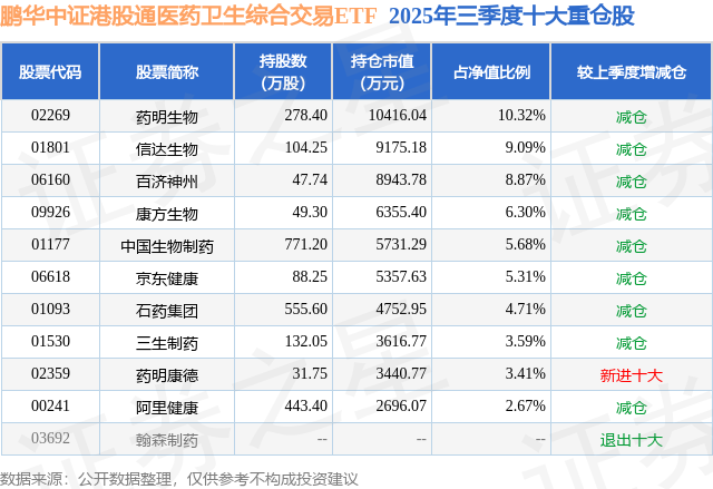 从基金规模来看,鹏华中证港股通医药卫生综合交易ETF基金2025年三季度公布的基金规模为10.09亿元,较上一期规模10.07亿元变化了216.23万元,环比变化了0.21%。该基金最新一期资产配置为:股票占净值比95.25%,无债券类资产,现金占净值比4.73%。从基金持仓来看,该基金当季前十大股票仓位达59.95%,第一大重仓股为药明生物(02269),持仓占比为10.32%。