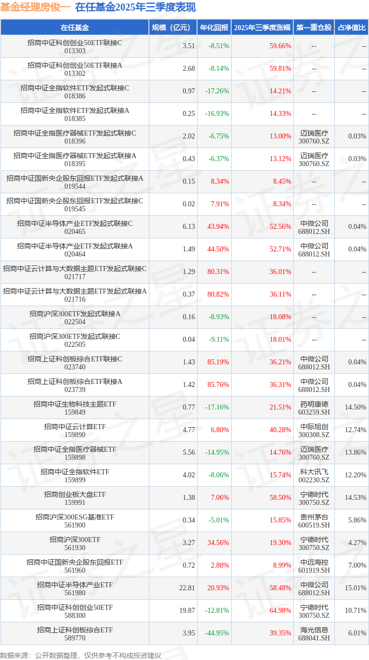 招商沪深300ESG基准ETF现任基金经理为房俊一。其中在任基金经理房俊一已从业1年又2天,2024年10月29日正式接手管理招商沪深300ESG基准ETF,任职期间累计回报为17.61%。目前还管理着27只基金产品(包括A类和C类),其中本季度表现最佳的基金为招商中证科创创业50ETF(588300),季度净值涨幅为64.98%。
