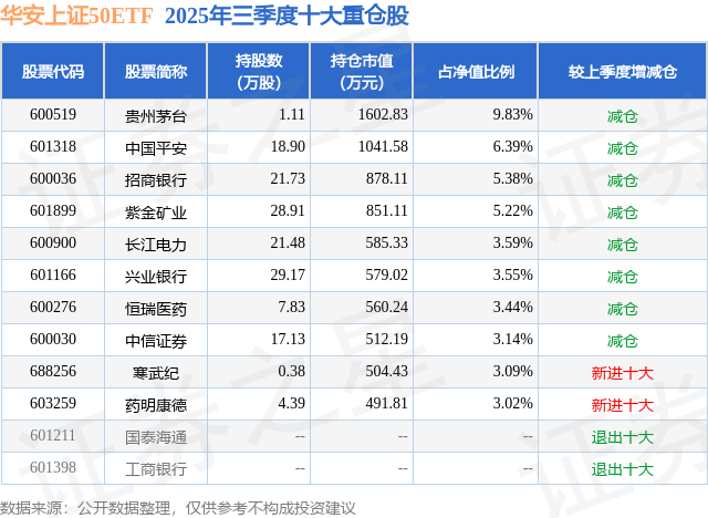 从基金规模来看,华安上证50ETF基金2025年三季度公布的基金规模为1.63亿元,较上一期规模1.7亿元变化了-697.03万元,环比变化了-4.1%。该基金最新一期资产配置为:股票占净值比99.18%,无债券类资产,现金占净值比0.92%。从基金持仓来看,该基金当季前十大股票仓位达46.65%,第一大重仓股为贵州茅台(600519),持仓占比为9.83%。
