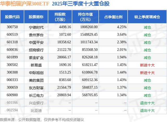 从基金规模来看,华泰柏瑞沪深300ETF基金2025年三季度公布的基金规模为255.81亿元,较上一期规模3747.04亿元变化了508.77亿元,环比变化了13.58%。该基金最新一期资产配置为:股票占净值比98.9%,无债券类资产,现金占净值比1.03%。从基金持仓来看,该基金当季前十大股票仓位达21.25%,第一大重仓股为宁德时代(300750),持仓占比为4.25%。