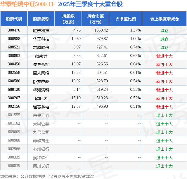 从基金规模来看,华泰柏瑞中证500ETF基金2025年三季度公布的基金规模为9.84亿元,较上一期规模10.24亿元变化了-4078.73万元,环比变化了-3.98%。该基金最新一期资产配置为:股票占净值比96.0%,债券占净值比0.01%,现金占净值比3.6%。从基金持仓来看,该基金当季前十大股票仓位达7.11%,第一大重仓股为胜宏科技(300476),持仓占比为1.37%。