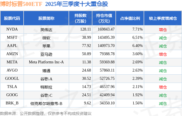 从基金规模来看,博时标普500ETF基金2025年三季度公布的基金规模为220.38亿元,较上一期规模200.02亿元变化了20.36亿元,环比变化了10.18%。该基金最新一期资产配置为:股票占净值比94.09%,无债券类资产,现金占净值比3.94%。从基金持仓来看,该基金当季前十大股票仓位达37.52%,第一大重仓股为英伟达(NVDA),持仓占比为7.71%。