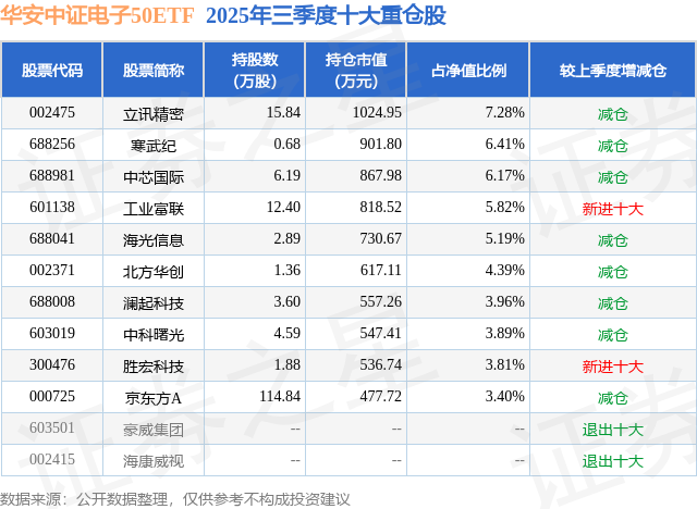 从基金规模来看,华安中证电子50ETF基金2025年三季度公布的基金规模为1.41亿元,较上一期规模1.48亿元变化了-758.62万元,环比变化了-5.12%。该基金最新一期资产配置为:股票占净值比98.89%,无债券类资产,现金占净值比1.43%。从基金持仓来看,该基金当季前十大股票仓位达50.32%,第一大重仓股为立讯精密(002475),持仓占比为7.28%。