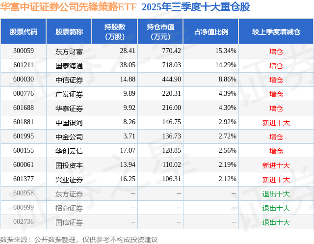证券之星消息,日前华富中证证券公司先锋策略ETF基金公布三季报,2025年三季度最新规模0.5亿元,季度净值涨幅为11.39%。