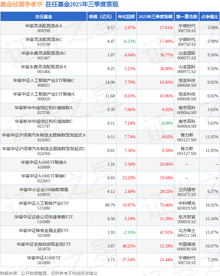 华富中证证券公司先锋策略ETF现任基金经理为李孝华。其中在任基金经理李孝华已从业4年又175天,2021年6月28日正式接手管理华富中证证券公司先锋策略ETF,任职期间累计回报为20.5%。目前还管理着18只基金产品(包括A类和C类),其中本季度表现最佳的基金为华富中证人工智能产业ETF(515980),季度净值涨幅为73.86%。