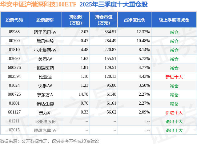 从基金规模来看,华安中证沪港深科技100ETF基金2025年三季度公布的基金规模为0.27亿元,较上一期规模3399.8万元变化了-685.46万元,环比变化了-20.16%。该基金最新一期资产配置为:股票占净值比96.22%,无债券类资产,现金占净值比4.02%。从基金持仓来看,该基金当季前十大股票仓位达56.0%,第一大重仓股为阿里巴巴-W(09988),持仓占比为12.32%。