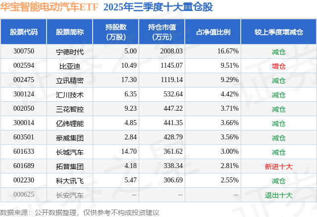 从基金规模来看,华宝智能电动汽车ETF基金2025年三季度公布的基金规模为1.2亿元,较上一期规模9266.49万元变化了2780.06万元,环比变化了30.0%。该基金最新一期资产配置为:股票占净值比99.01%,无债券类资产,现金占净值比1.08%。从基金持仓来看,该基金当季前十大股票仓位达59.18%,第一大重仓股为宁德时代(300750),持仓占比为16.67%。
