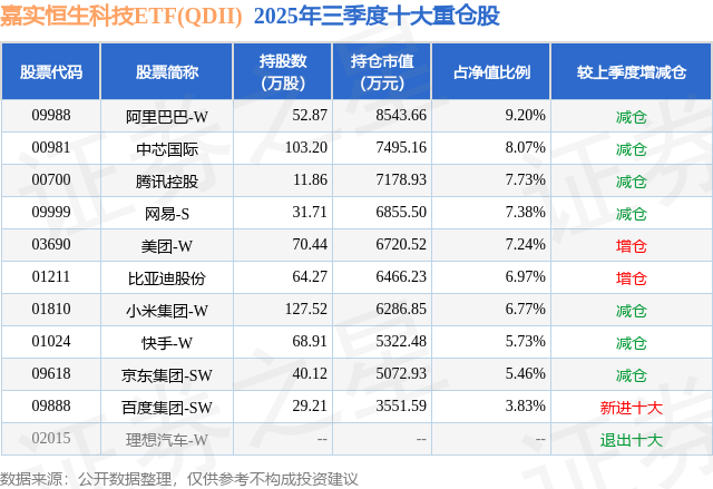从基金规模来看,嘉实恒生科技ETF(QDII)基金2025年三季度公布的基金规模为9.28亿元,较上一期规模8.11亿元变化了1.17亿元,环比变化了14.46%。该基金最新一期资产配置为:股票占净值比98.83%,无债券类资产,现金占净值比1.25%。从基金持仓来看,该基金当季前十大股票仓位达68.38%,第一大重仓股为阿里巴巴-W(09988),持仓占比为9.2%。
