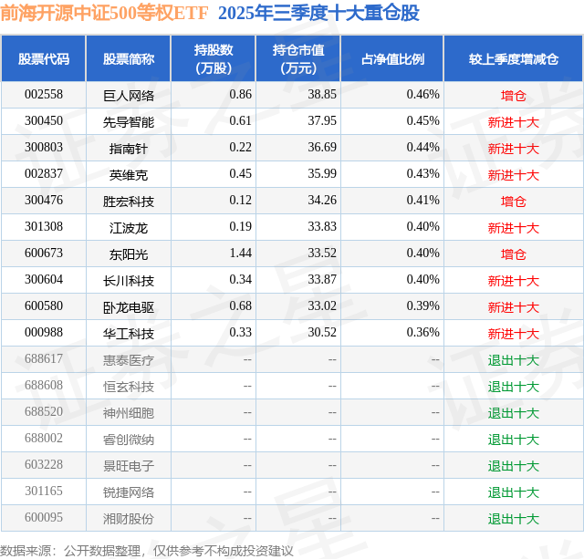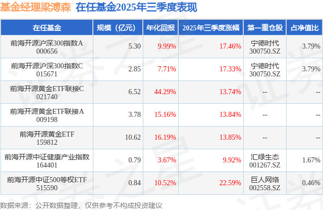从基金规模来看,前海开源中证500等权ETF基金2025年三季度公布的基金规模为0.84亿元,较上一期规模5061.22万元变化了3325.34万元,环比变化了65.7%。该基金最新一期资产配置为:股票占净值比96.42%,债券占净值比0.48%,现金占净值比2.69%。从基金持仓来看,该基金当季前十大股票仓位达4.14%,第一大重仓股为巨人网络(002558),持仓占比为0.46%。