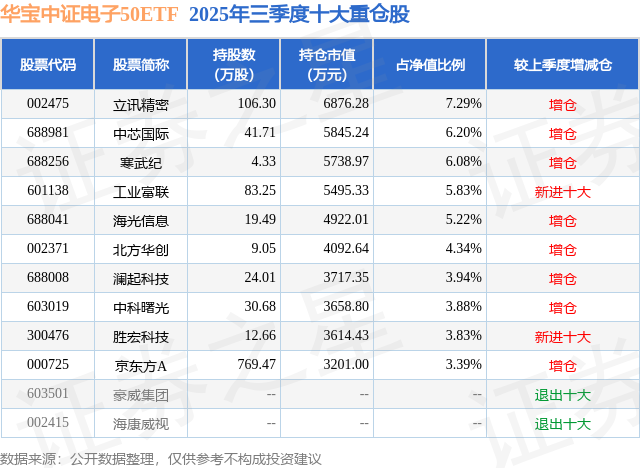 证券之星消息,日前华宝中证电子50ETF基金公布三季报,2025年三季度最新规模9.43亿元,季度净值涨幅为57.72%。