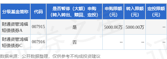 注:(1)根据法律法规和基金合同的相关规定,自2025年10月29日起,财通证券资产管理有限公司(以下简称“本公司”)将调整财通资管鸿福短债债券型证券投资基金(以下简称“本基金”)A类份额的大额申购(含转换转入、定期定额投资)业务。届时起,若单日单个基金账户的非个人投资者的单笔申购(含转换转入、定期定额投资)金额超过人民币5000万元(不含)的,本公司将有权对超过5000万元的部分予以拒绝。若单日单个基金账户的非个人投资者的多笔累计申购(含转换转入、定期定额投资)金额超过人民币5000万元(不含),则对申请按照申请金额从大到小排序,逐笔累加至符合不超过人民币5000万元(含)限额的申请确认成功,对超过5000万元的部分及其余笔数本公司将有权予以拒绝。