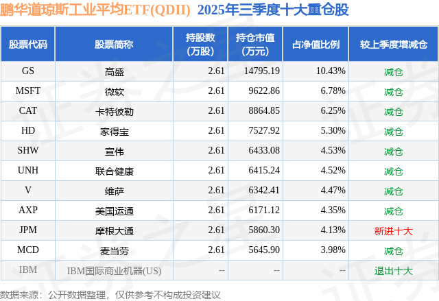 从基金规模来看,鹏华道琼斯工业平均ETF(QDII)基金2025年三季度公布的基金规模为14.19亿元,较上一期规模15.48亿元变化了-1.29亿元,环比变化了-8.33%。该基金最新一期资产配置为:股票占净值比98.82%,无债券类资产,现金占净值比1.23%。从基金持仓来看,该基金当季前十大股票仓位达54.74%,第一大重仓股为高盛(GS),持仓占比为10.43%。